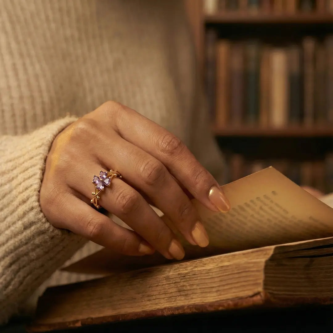 Invite a touch of vintage romance into your everyday with this enchanting floral vine ring. Inspired by secret gardens, it features delicate, intertwining gold boughs holding a sparkling quartet of soft purple stones formed into a lucky clover. It radiates a warm, intellectual charm, perfect for adding a graceful flourish to a cozy sweater-weather look. This whimsical little treasure feels personal, timeless, and effortlessly elegant on the hand.