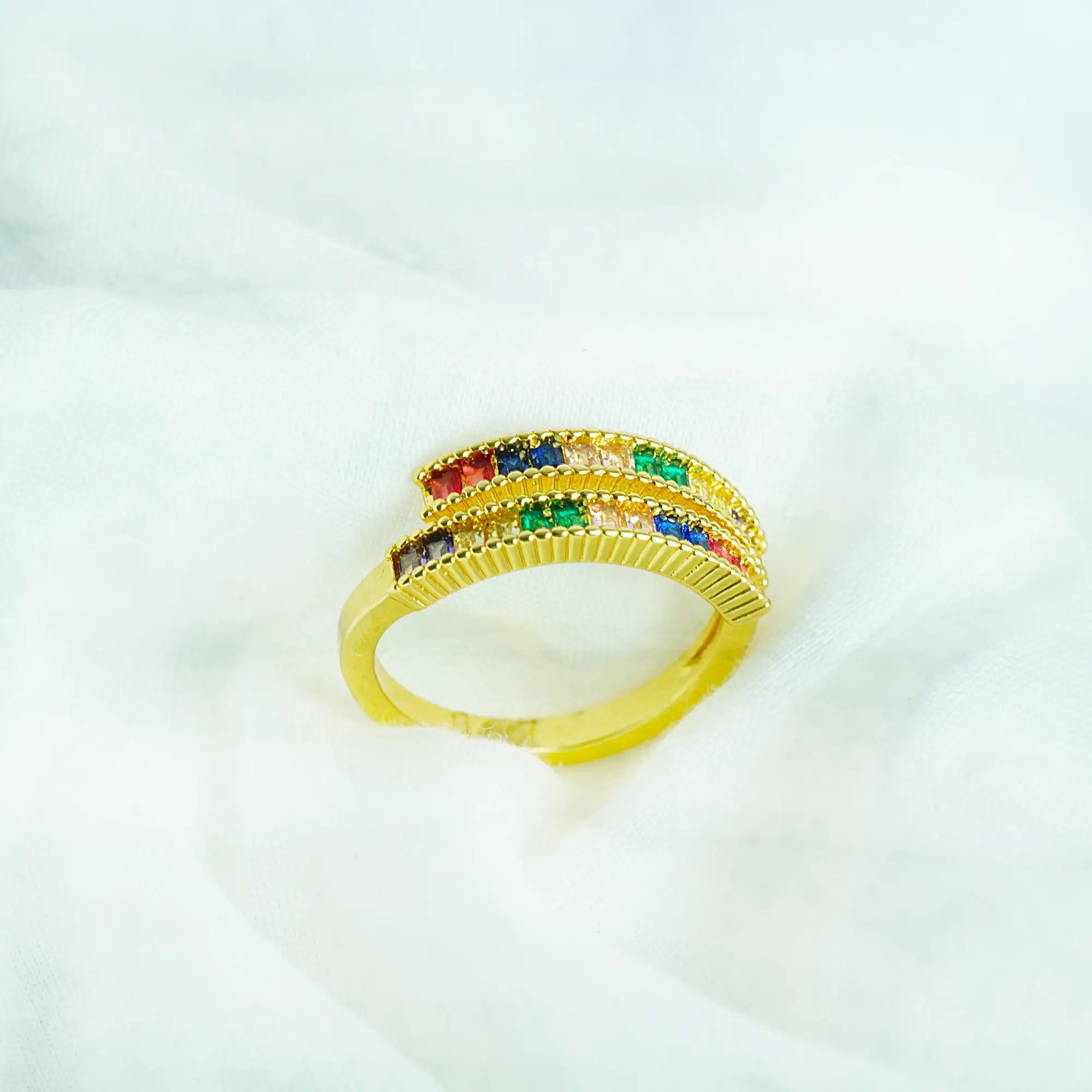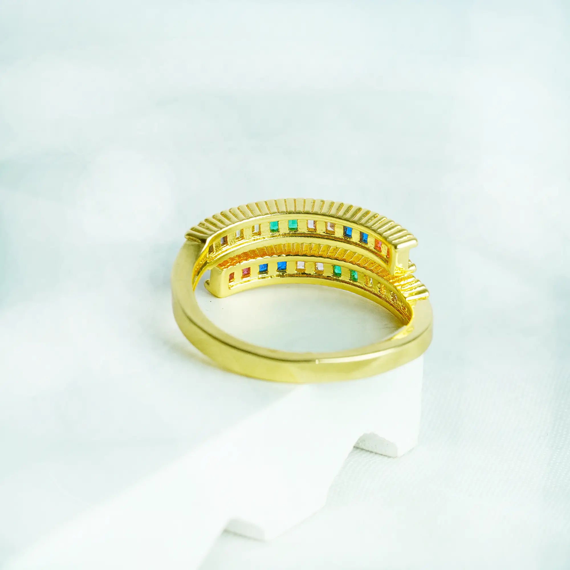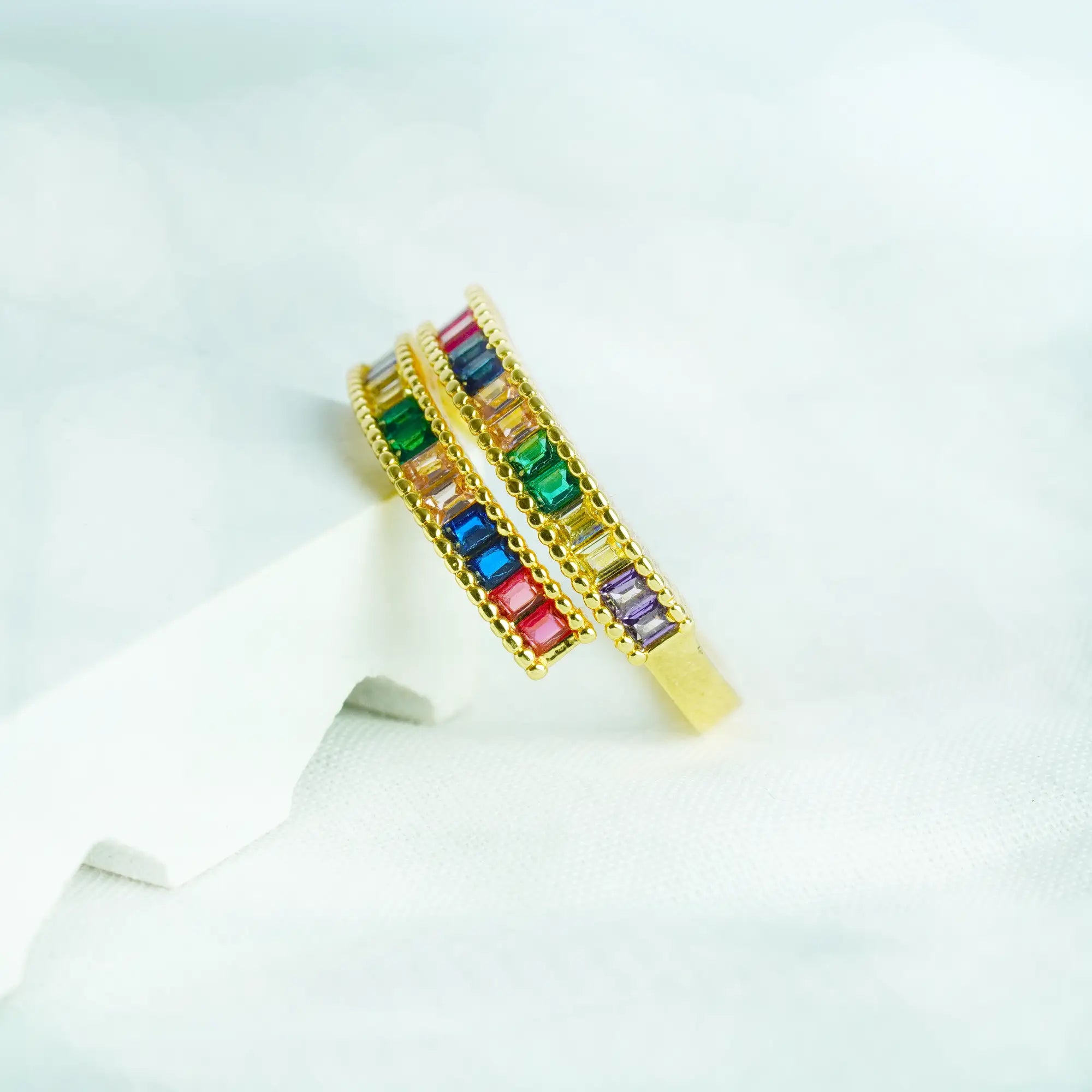 Adorn your hand with the brilliance of a rainbow captured in a radiant arc of color. Our Chroma Arc Ring is a masterpiece of modern design, featuring two graceful bands of gleaming gold-tone metal that sweep into an elegant bypass embrace. Each band is meticulously set with a vibrant spectrum of square-cut, premium American diamonds, creating a dazzling kaleidoscope of green, blue, red, and champagne hues.