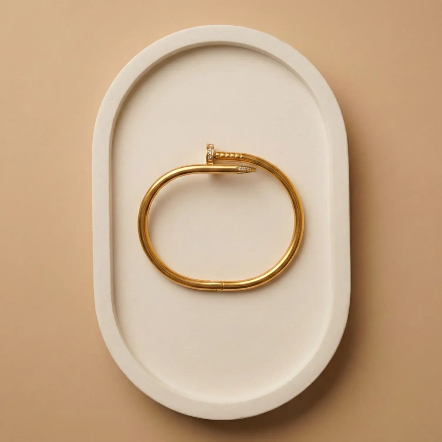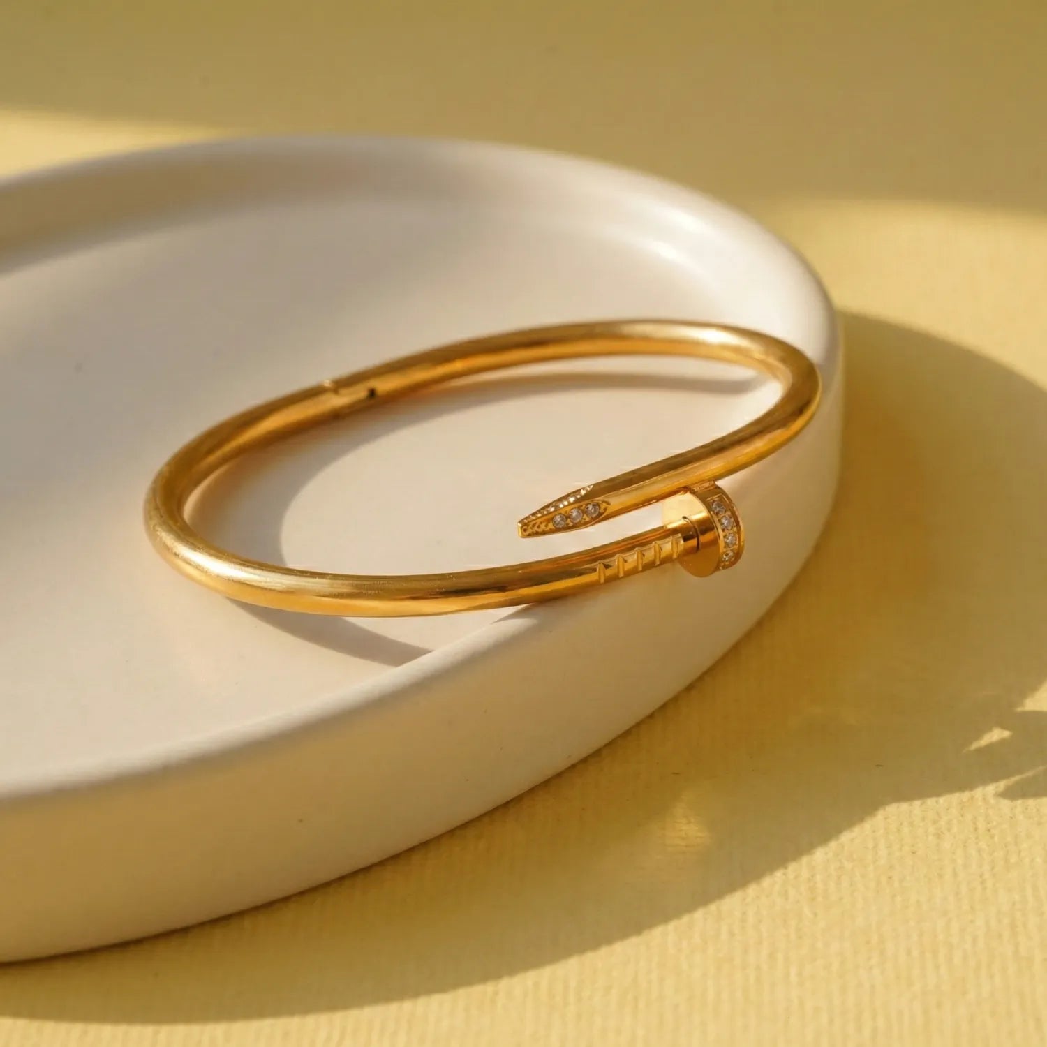 A refined interpretation of industrial inspiration, this golden nail bangle captures attention with its sculptural silhouette. Crafted in high-polish 304 stainless steel, the sleek nail design curves gracefully around the wrist, accented with delicate zircon stones at the tip and head for a subtle shimmer. Its smooth, rounded form feels modern yet timeless, creating an elegant statement without excess. Wear it solo for a sophisticated finish or stack it for a versatile, layered look suited to daily wear or holiday occasions.